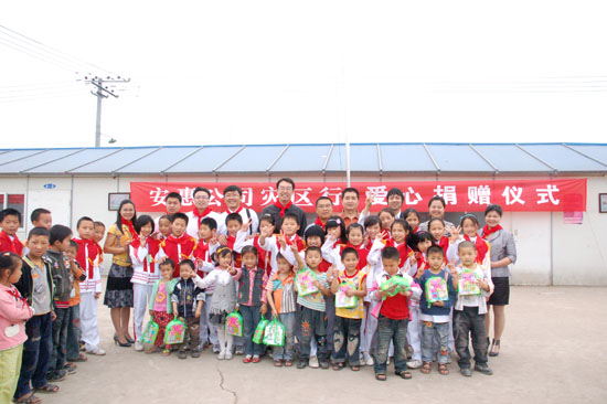 2009年5月12-13日,安惠公司舉行大地震周年系列紀(jì)念活動。副總經(jīng)理柯建民再赴德陽,給綿竹拱星小學(xué)孩子們送去“愛心包裹”。
