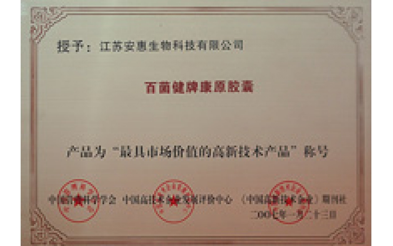 2007年1月24日,安惠百菌健牌康原膠囊產(chǎn)品獲得中國管理科學(xué)學(xué)會、中國高技術(shù)企業(yè)發(fā)展評價中心、中國高新技術(shù)企業(yè)期刊社聯(lián)合評定的“最具市場價值的高新技術(shù)產(chǎn)品”榮譽(yù)稱號。同時,百菌健牌康原膠囊還與公司的另一產(chǎn)品——靈芝孢子蟲草菌絲體粉攜手獲得“江蘇省名牌產(chǎn)品”榮譽(yù)稱號。