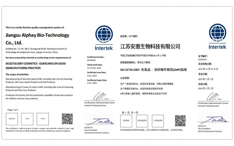 2023年1月,安惠公司化妝品生產(chǎn)系統(tǒng)順利通過認(rèn)證公司Intertek的嚴(yán)格審核,獲得ISO22716質(zhì)量管理體系認(rèn)證,即國際化妝品GMP認(rèn)證。化妝品GMP管理系統(tǒng)的目標(biāo)是通過對(duì)生產(chǎn)流程中的每項(xiàng)工作、每個(gè)環(huán)節(jié)和每道工序都進(jìn)行高標(biāo)準(zhǔn)的規(guī)范和要求,消除和防止產(chǎn)品在制造過程中的質(zhì)量缺陷,避免化妝品產(chǎn)品對(duì)使用者的潛在危險(xiǎn);GMP認(rèn)證的最大優(yōu)點(diǎn)是證實(shí)生產(chǎn)企業(yè)的廠房、人員、設(shè)施、材料的采購和使用及產(chǎn)品制造過程控制、工廠和人員衛(wèi)生管理、質(zhì)量管理體系均達(dá)到了世界先進(jìn)水平。