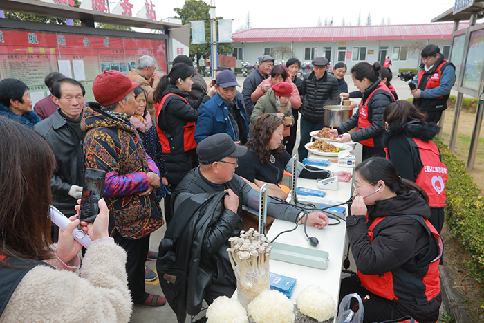 在闞家庵村活動中心,黨總支書記陳忠熱情地接待了安惠江海志愿者一行,并簡要介紹村情??v有春寒料峭,也抵擋不住大家的熱情,學(xué)雷鋒活動吸引了眾多村民前來參加。安惠江海志愿者熱心地為村民們測量血壓,提供健康咨詢。安惠會議中心大廚精心準(zhǔn)備了美味的菌菇菜肴:黑椒汁杏鮑菇、糖醋木耳、蛋黃蟹味菇、南瓜茸銀耳,引得村民們連連豎起大拇指:“好吃好吃真好吃!”這些菌菇要怎么烹飪?里面加了什么材料?吃了對人體有什么好處?安惠江海志愿者詳細(xì)地為村民們一一解答,并為他們普及“一葷一素一菇”的健康飲食理念。